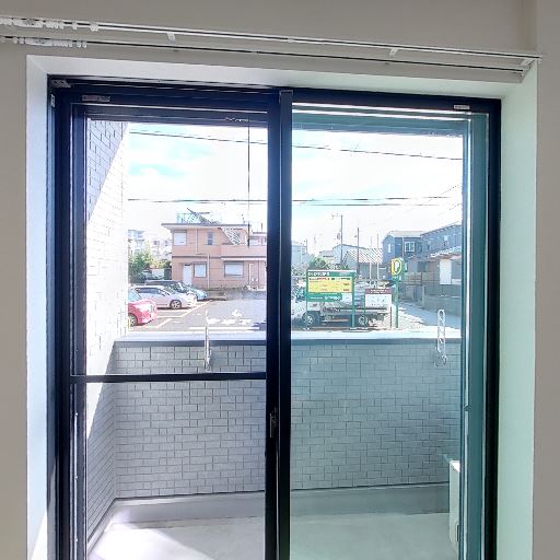 バルコニー付きの大きな掃き出し窓(確度86%):床までのガラス戸と手すり壁のあるバルコニーが見える。屋外の抜けもあり、日中は自然光が入りやすい。