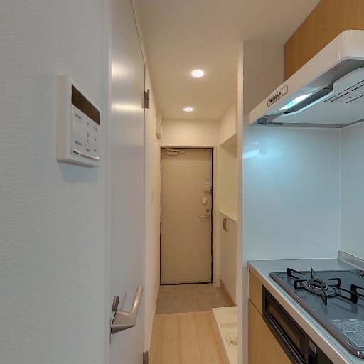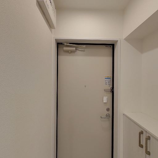 収納・カウンター収納の存在(確度74%):廊下右手に扉付きの収納/カウンターがあり、上部にオープンスペースもある。