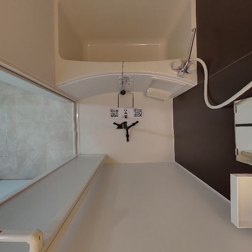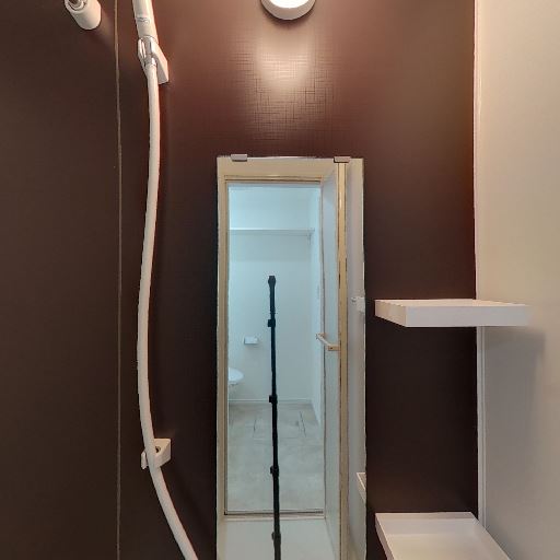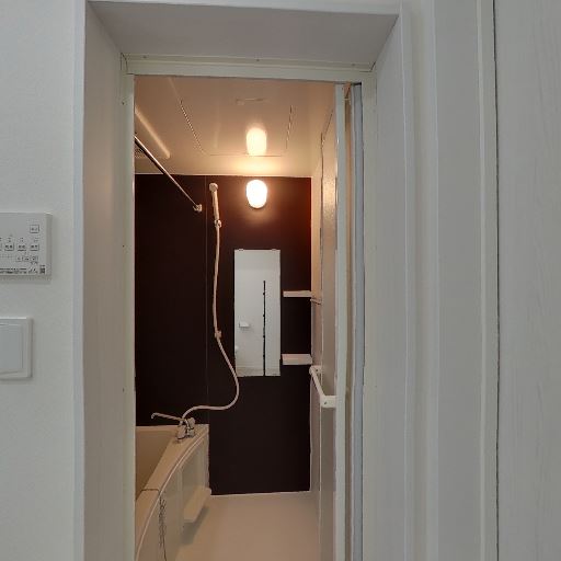 浴室の様子(確度80%):隣接するユニットバスが見え、シャワー・浴槽・室内灯が確認できる。