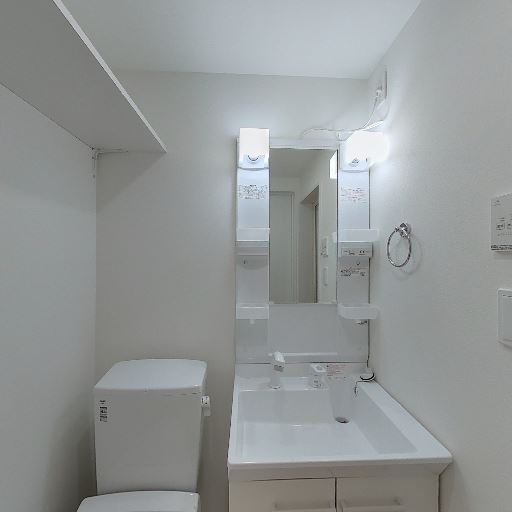 独立洗面台と収納(確度85%):照明付き三面鏡タイプの洗面台があり、下部に引き出し収納も見える。