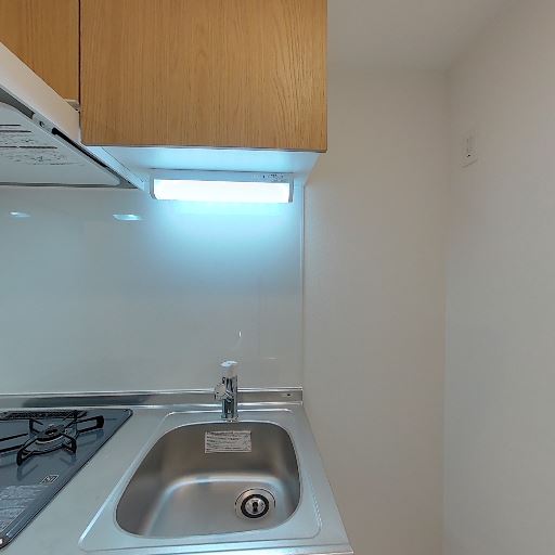コンパクトだが設備の整ったキッチン(確度88%):2口ガスコンロ、シンク、上下収納、調理スペースが確認できる。