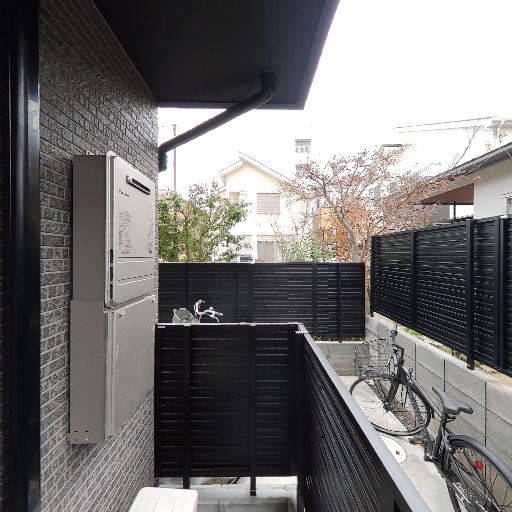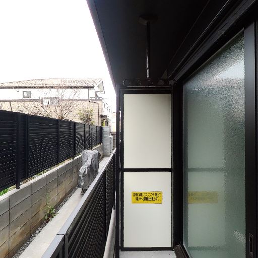 1階・道路/隣地との距離が近いベランダ(確度80%):黒い目隠しフェンスとブロック塀で囲われた細長い専用庭/ベランダ。隣地通路との距離が近く、人通りや視線が入りやすい配置に見える。
