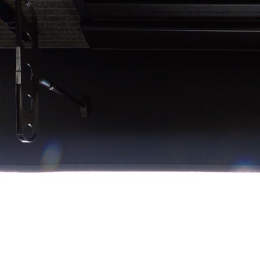 バルコニー付きの掃き出し窓(確度84%):曇りガラスの引き違い窓があり、その先に手すり・バルコニーが見える。