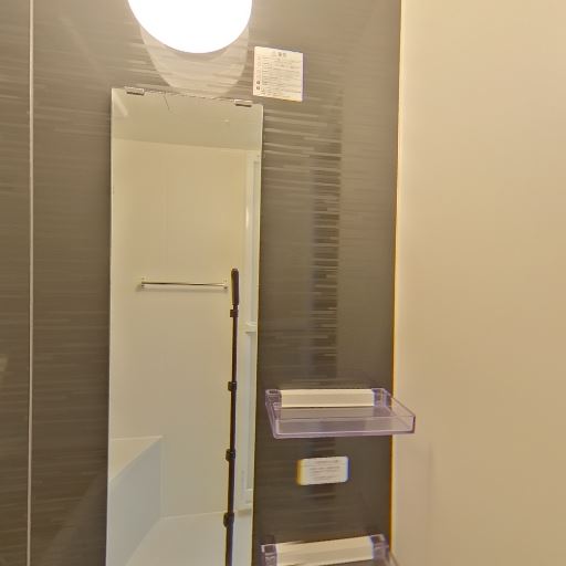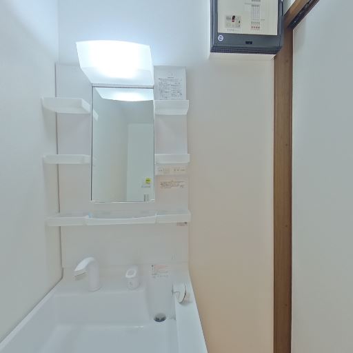 • 独立洗面台と収納棚(確度84%):鏡付きの独立洗面台があり、左右に小物用の棚が複数備わっている。自動水栓風のノズルで、洗面ボウルも広めに見える。