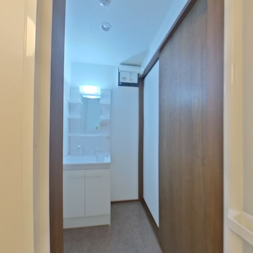 • 洗面所への動線(確度80%):浴室の引き戸の先に洗面台があり、脱衣所と隣接している。