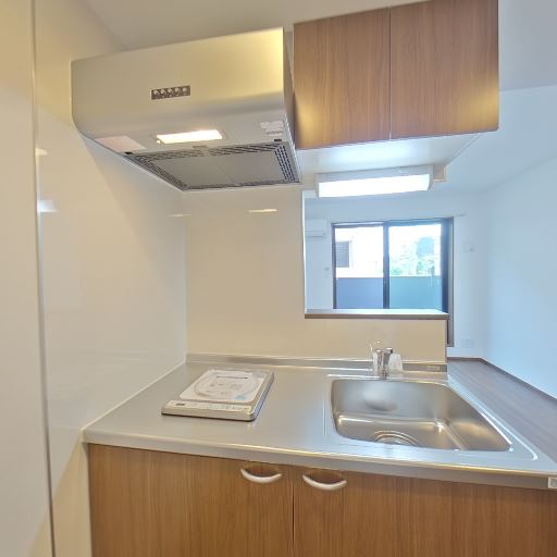 • 対面キッチンとIHコンロ(確度90%):シンクと1口IHコンロのあるカウンター型の対面キッチン。レンジフード・吊戸棚も確認できる。