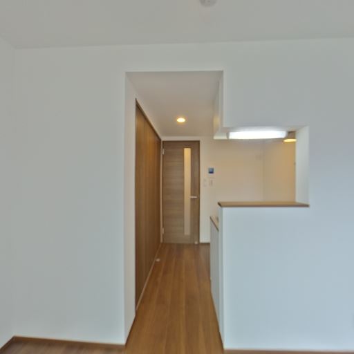 • キッチンとの一体空間(確度78%):室内からカウンター越しにキッチンが見え、扉のある廊下・収納も確認できる。
