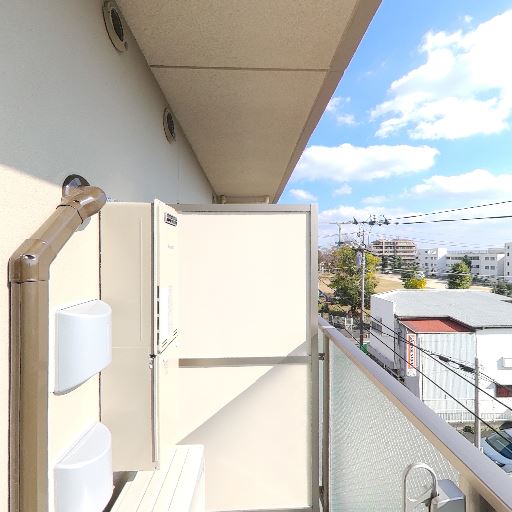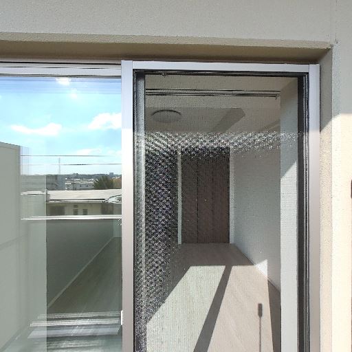 バルコニーの広さと設備(確度74%):奥行きは限られるが、人が通れる幅と物干し金物が両側にあり、室外機が置ける。手すりはすりガラスで目隠し。