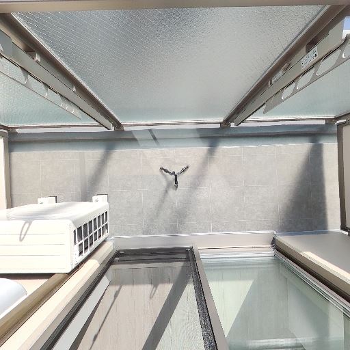 上階からの雨避け(確度71%):しっかりした庇と上部の屋根パネルがあり、雨天時も多少の雨はしのげる構造。