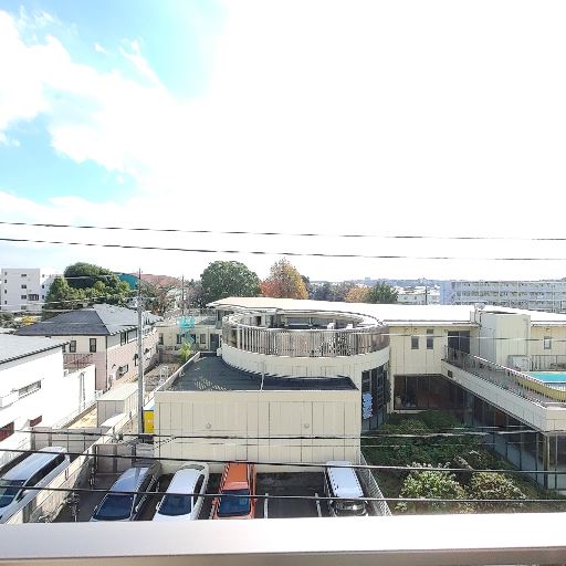 眺望の抜け感(確度86%):正面に建物はあるが距離があり、視界は開けている。低層の屋上施設や駐車場が見え、遠景まで見渡せる。