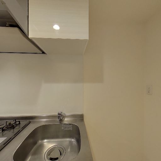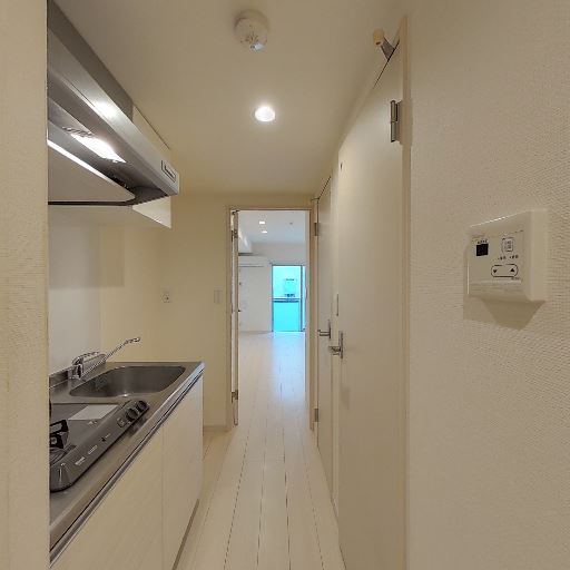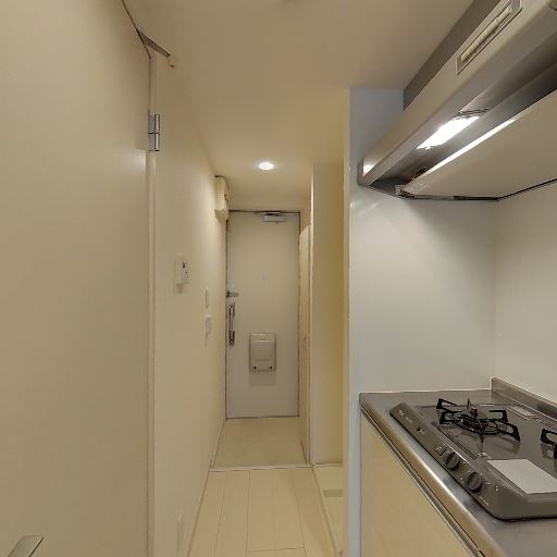 キッチンの配置(確度88%):玄関からすぐ左に一口コンロのミニキッチンが並び、通路型レイアウト。レンジフードとシンクが一体で省スペース。