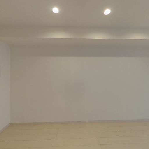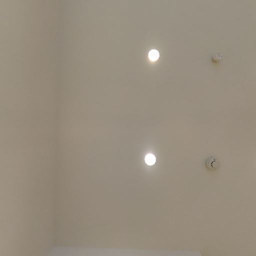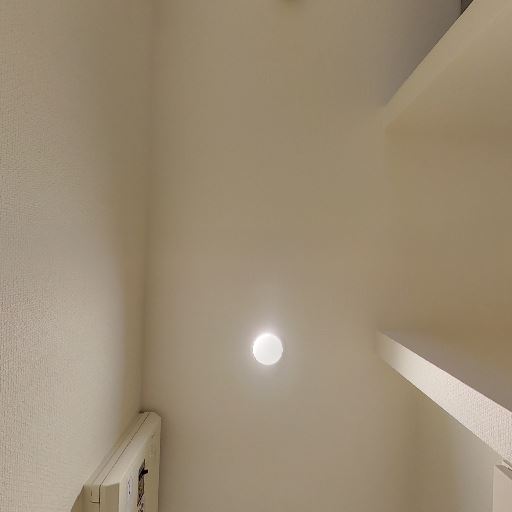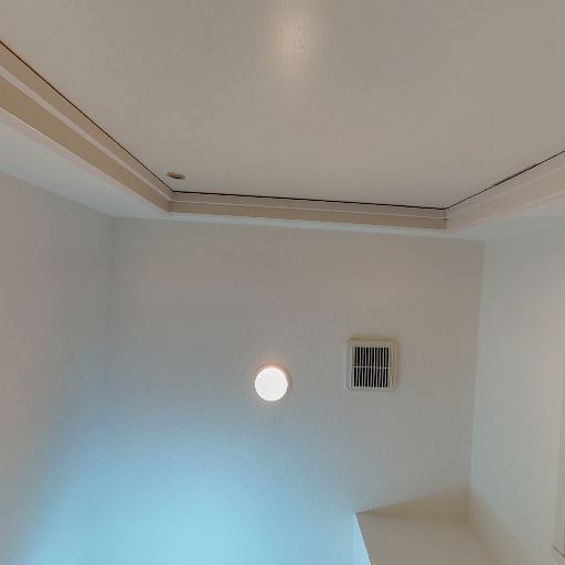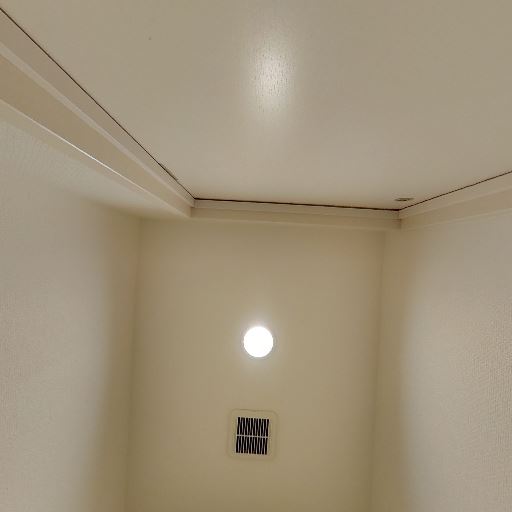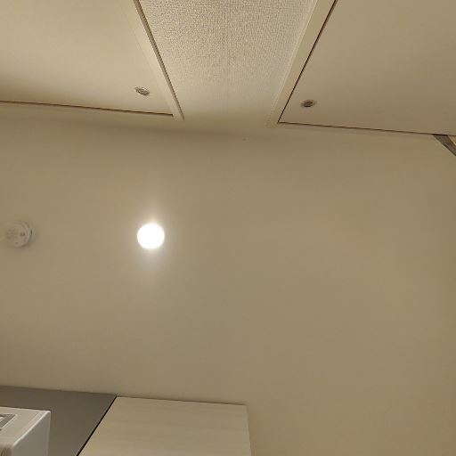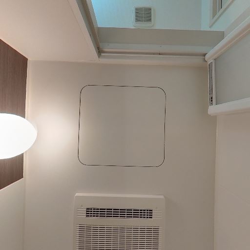 換気設備・照明(確度80%):天井にダウンライトと換気口が設置されている。窓は見当たらない。