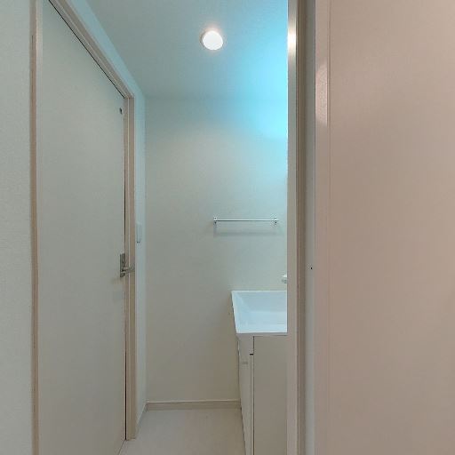 洗面脱衣所への動線(確度72%):浴室扉の外に洗面台と脱衣スペースが見える。