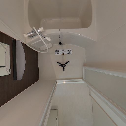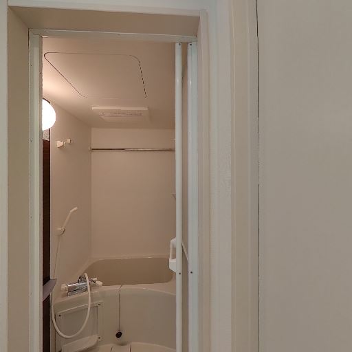浴室が近接(確度86%):洗面所から直接浴室へ出入りできる引き戸があり、浴槽とシャワー設備が確認できる。