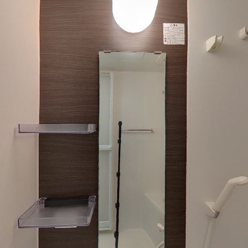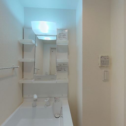 独立洗面台と収納棚(確度90%):鏡付きの独立洗面台があり、左右に小物用の棚が複数備わっている。コンセントや操作パネルも見える。