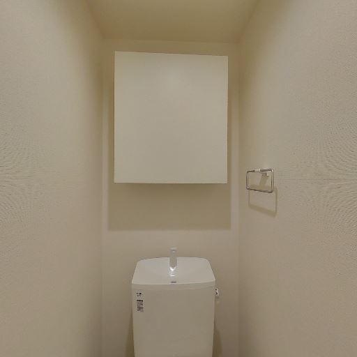 収納キャビネットあり(確度86%):便器正面上部に吊り戸棚があり、トイレットペーパー等の収納に使えそう。