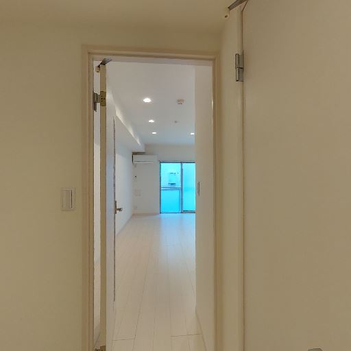 玄関から居室への抜け(確度80%):キッチン脇の廊下の先に居室が見え、奥にはバルコニー側の窓がある。