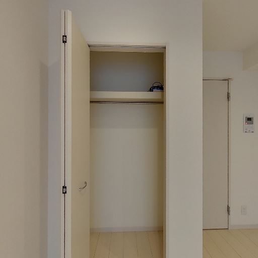 クローゼット収納(確度86%):扉付きのクローゼットがあり、上部棚とハンガーパイプが備わっている。