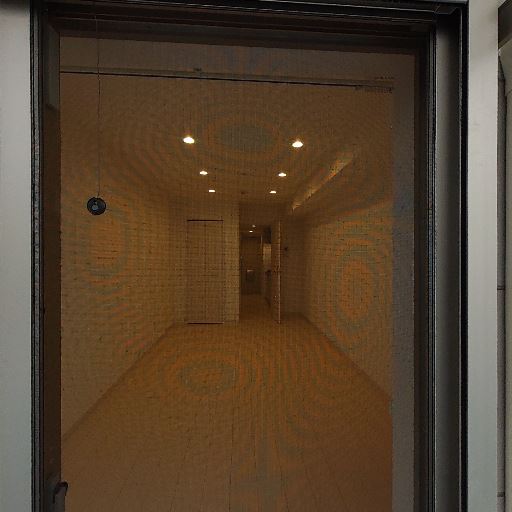 室内側はダウンライトで明るい(確度69%):窓越しに室内の天井ダウンライトが多数見え、照明計画が充実している。