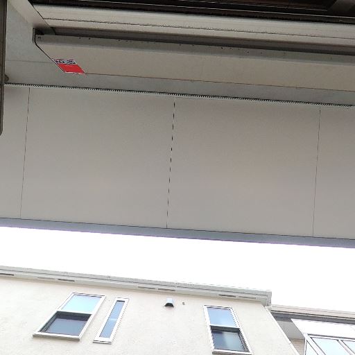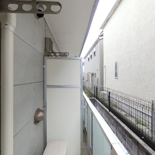 屋根付きで雨天時でも洗濯物が干しやすい(確度81%):バルコニー上部にしっかりした庇があり、物干し金具も設置されている。
