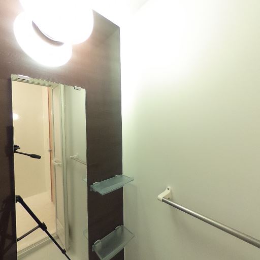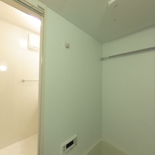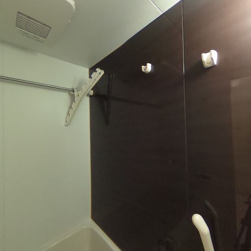室内物干し・タオル掛け(確度70%):壁にタオルバーがあり、浴室乾燥機もしくは換気設備らしき機器が見える。