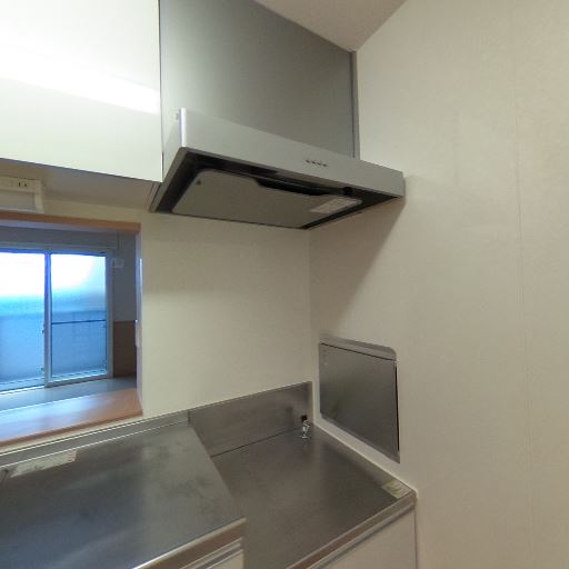 キッチン設備の状態(確度78%):シンク・作業台・レンジフード・吊戸棚が見え、ステンレス天板が清潔で新しめに見える。コンロは画角外だが、流しと換気は整っている。