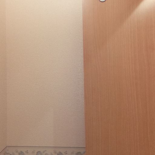 内装の仕上げ(確度64%):腰壁風の木目パネルと白壁で明るい内装。壁や建具に大きな傷や汚れは見当たらない。