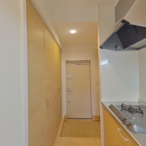 • 収納の確保(確度80%):キッチン対面側に背の高いクローゼットが並ぶ。吊戸棚もあり収納量は比較的確保されている。