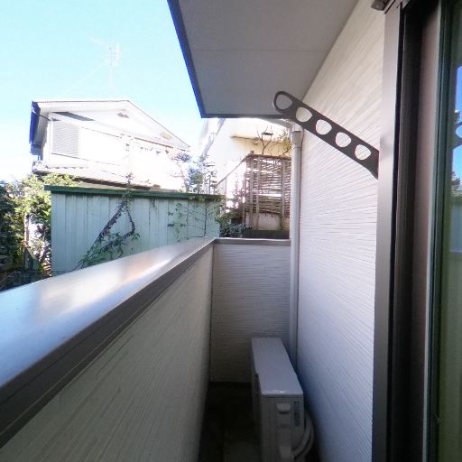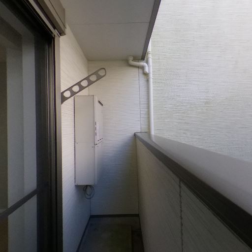 • バルコニー(狭め)と物干し金具あり(確度88%):スリムなバルコニースペースに物干し金具が設置されている。幅は人が通れる程度で、室外機が占有している。