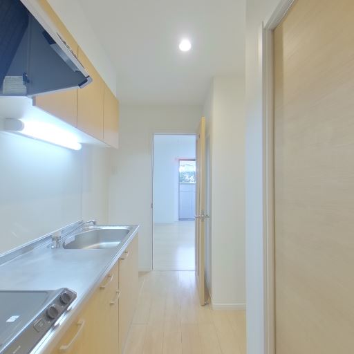 • 明るい照明と清潔感のある内装(確度90%):キッチン手元灯と天井ダウンライトで十分な明るさ。壁・天井・床は淡色で統一され、全体的に清潔感がある。