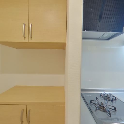 • 単身向けのコンパクトなキッチン(確度86%):1口ガスコンロと小さめのシンク、壁付けの吊戸棚で省スペース設計。作業スペースはやや狭い。