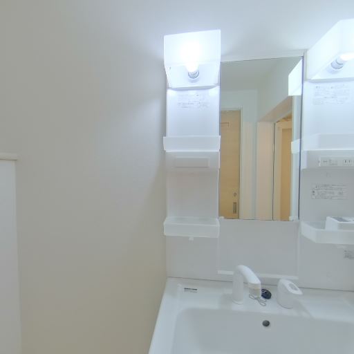 • 独立洗面台と三面鏡収納(確度86%):照明付きのミラーキャビネットとボウルが確認でき、サイドの棚もあり洗面収納が充実している。