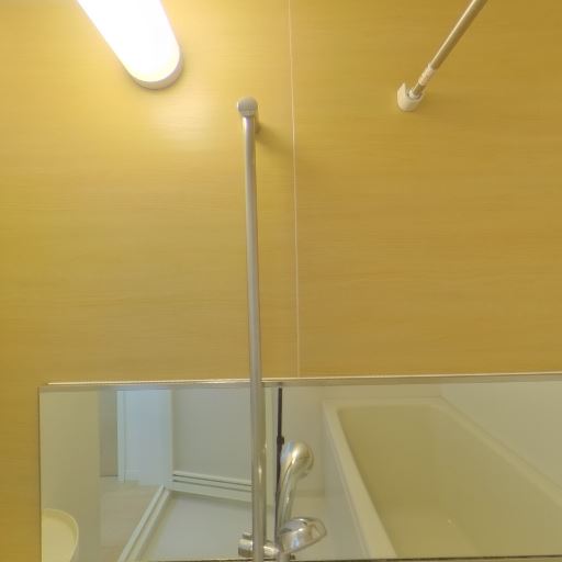 • 浴室乾燥・換気設備あり(確度86%):天井に換気グリルが見え、物干しバーも設置されている。