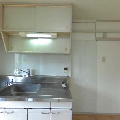 キッチンの広さと収納(確度74%):壁付けのシンプルなキッチンで作業スペースと収納は必要最低限。吊戸棚あり。