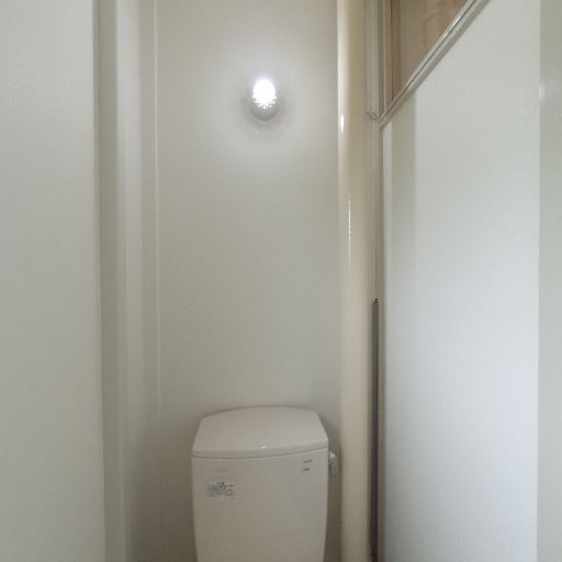 照明は壁付けダウンライト(確度72%):便器背面上部に小型の照明が設置されている。光量はやや控えめに見える。