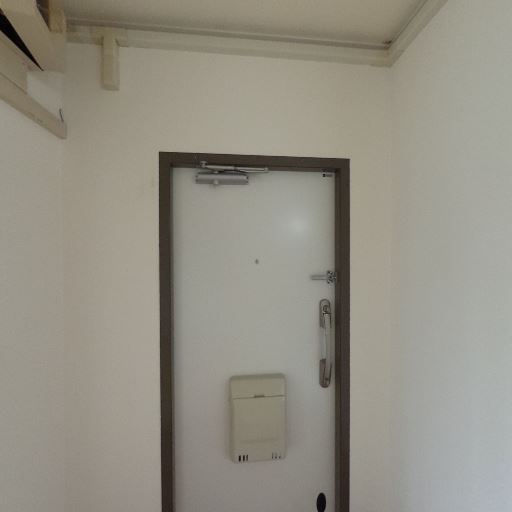 玄関ドアと設備の年代感(確度77%):スチールドアにドアクローザー・郵便受け付き。周囲の巾木や配管の露出、天井の経年感が見られる。