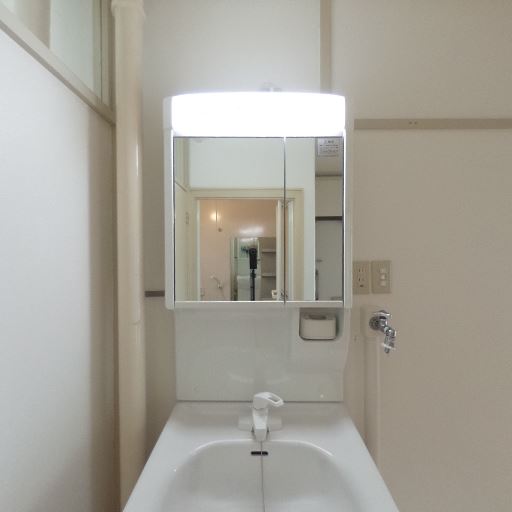 独立洗面台と鏡収納(確度86%):洗面台に照明付き三面鏡の収納があり、小物を収められる。