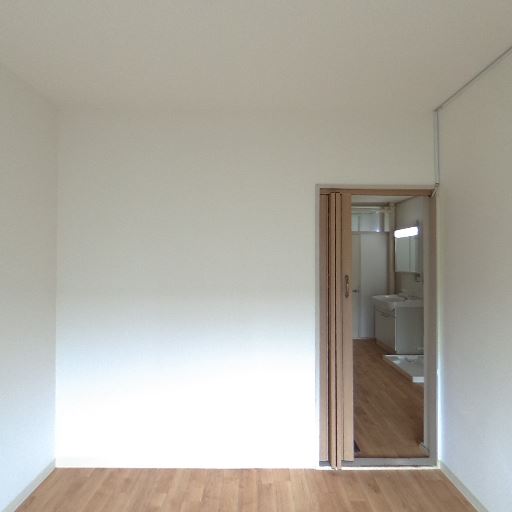 隣接スペースへの動線(確度64%):折れ戸の先にキッチン・洗面のような水回りが続いており、ワンルームに近いレイアウト。