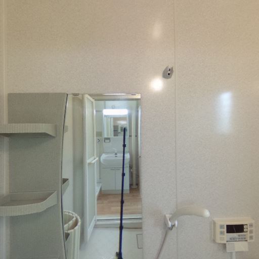 追い焚き/給湯リモコンの存在(確度79%):浴室内の壁に給湯リモコンが見える。