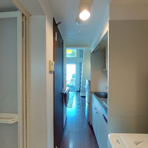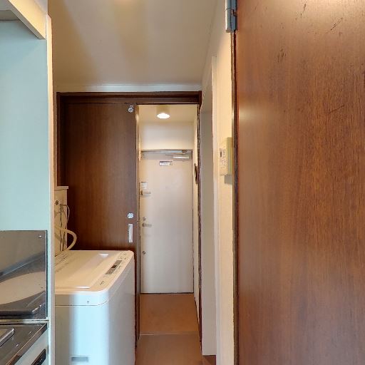 洗濯機置き場が室内キッチン横(確度82%):通路側に洗濯機が設置されており、玄関からキッチンへ続く動線上にある。