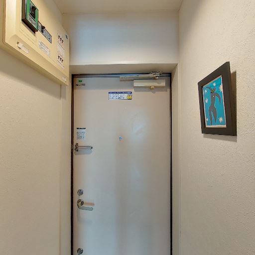 玄関収納・飾りスペースは最小限(確度64%):玄関周りはフラットで、下駄箱やハンガーなどの収納は見当たらない。壁に小さなアートがあるのみ。