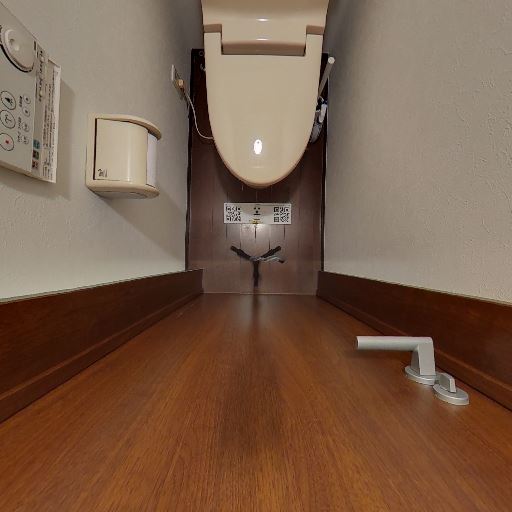 個室トイレの設備(確度88%):温水洗浄便座付きの洋式トイレ。操作パネルが壁にあり、紙巻器も設置済み。タンク上に手洗いあり。