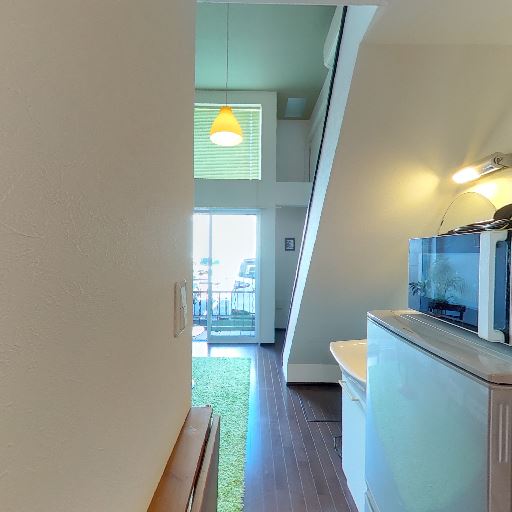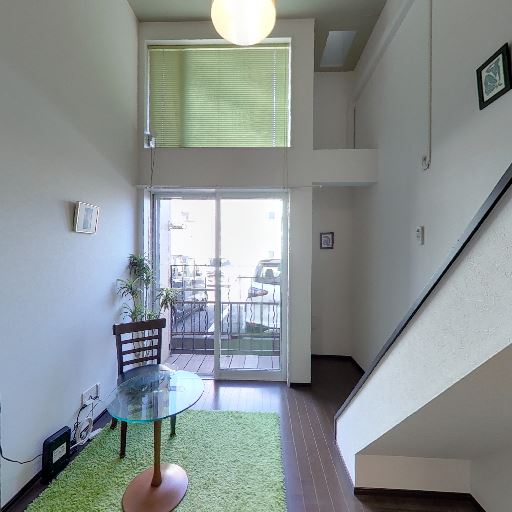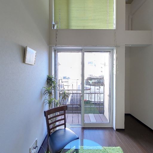 ロフト付きの高天井(確度86%):天井が高く、上部にロフトや手すりが見える構造。空間の縦方向にゆとりがある。