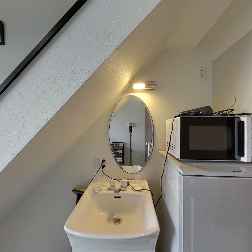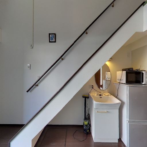 独立洗面台の設置(確度80%):階段下スペースに小型の洗面台と鏡が設置されている。