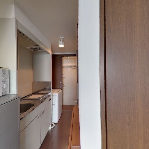 キッチンはコンパクト(確度74%):冷蔵庫や電子レンジが隣接し、通路幅はややタイト。単身向けサイズのキッチンに見える。