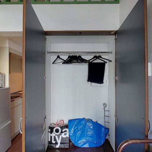 クローゼット収納(確度83%):両開きのクローゼットがあり、ハンガーパイプと下部スペースが確保されている。