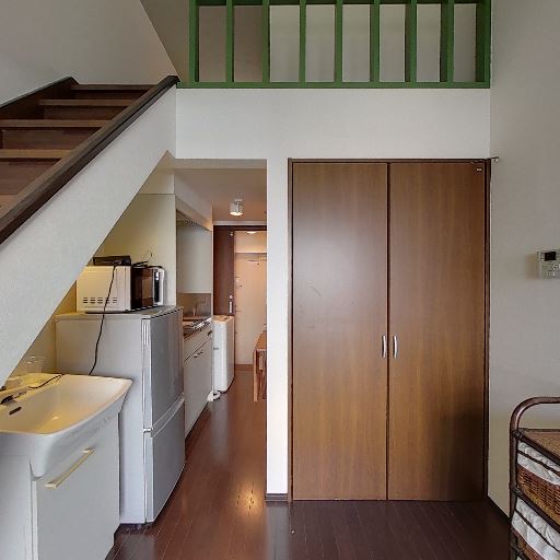 ミニキッチンと家電置き場(確度74%):シンク横に冷蔵庫・電子レンジが並ぶコンパクトな配置。作業スペースは限られる。