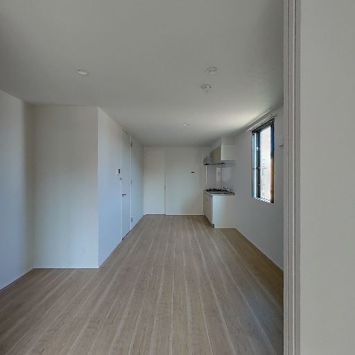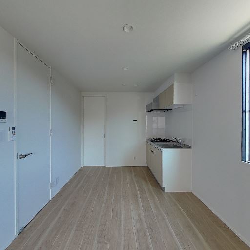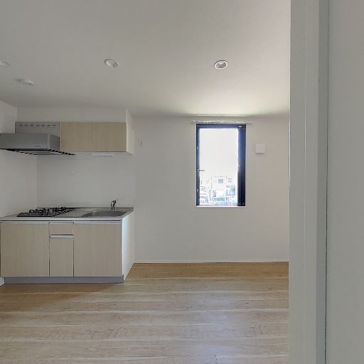 細長いリビング形状(確度76%):キッチンから奥まで一直線の細長いワンルーム形状。家具配置は壁付けが中心になり、動線計画に注意が必要。