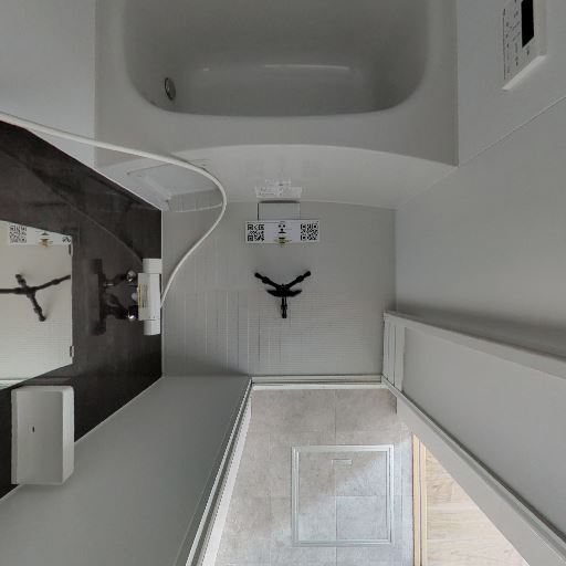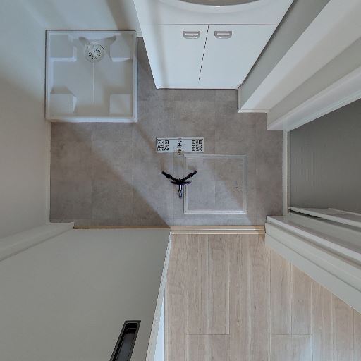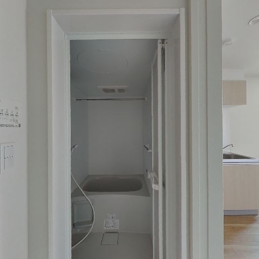 脱衣所と浴室が明確に区切られている(確度73%):浴室の入口先に脱衣スペースと洗濯機置き場らしきパンが見える。