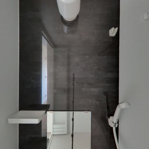 シャワー・カウンター・鏡付きの標準的な設備(確度80%):ダーク系パネルの壁に鏡、シャワー、カウンター、棚が確認できる。清掃しやすいユニットタイプ。